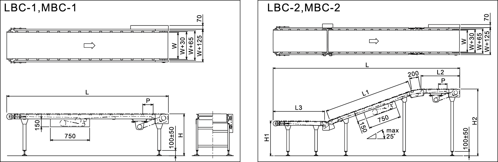 | Largura do transportador | 140 | 190 | 240 | 290 | 340 | 390 | 440 | 540 | 640 | |||||||||