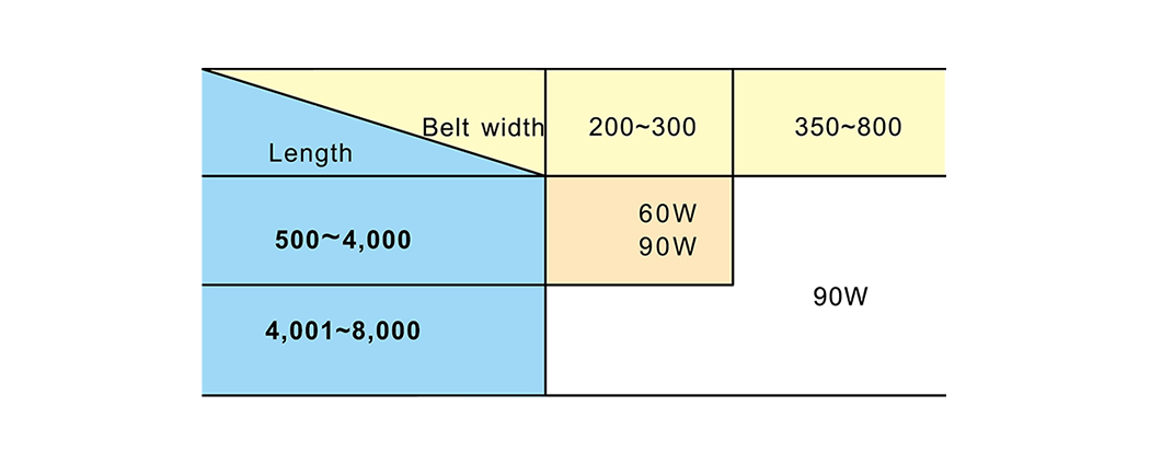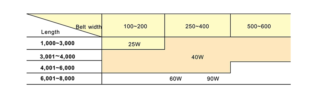 A dimensão real da correia é estreitada 5 mm do que a correia padrão; Se o comprimento da máquina exceder 4m, com especificações da correia 500, 600 para largura, será reduzida a 10 mm.