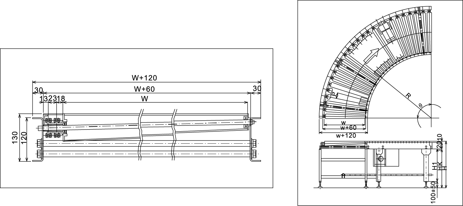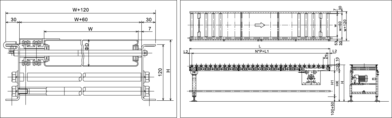 | Pitch roller | P (mm) | 50 · 75 · 100 | 75 · 100 · 150 | 75 · 100 · 150 | 75 · 100 · 150 | 100 · 200 | 100 · 200 |