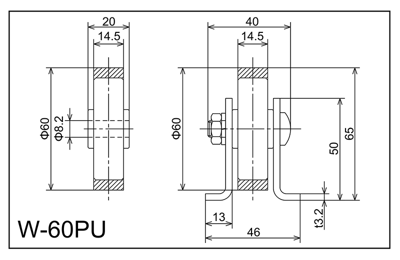 | W-60PU | 60x14.5x8.2x20 | M8X35L | 50x46x13x40x3.2 | 65 | 1800 · 2400 · 3000 | 75 · 100 · 150 · 200 | 50 | C | PU |
