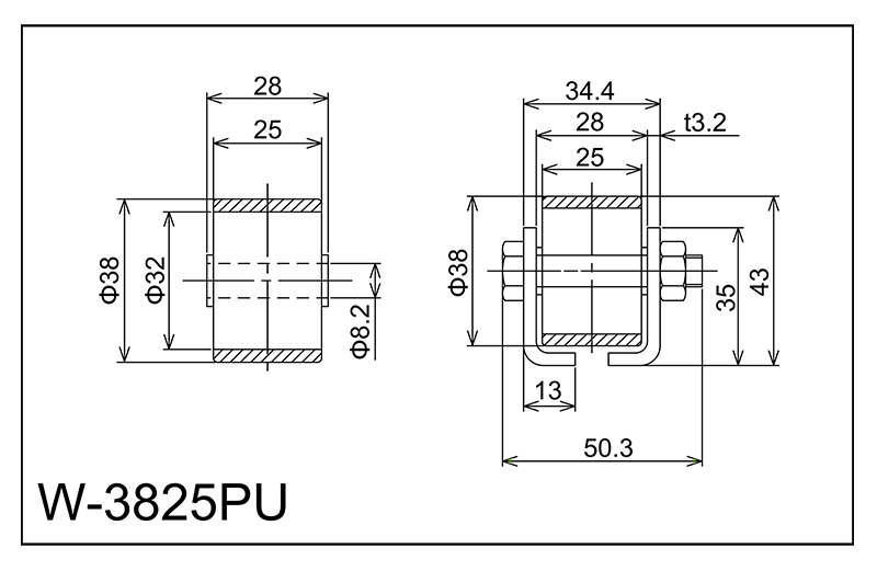 | W-3825PU | 38x25x8.2x28 | M8X48L | 35x34.4x13x50.3x3.2 | 43 | 1800 · 2400 · 3000 | 50 · 75 · 100 · 150 | 50 | A | PU |